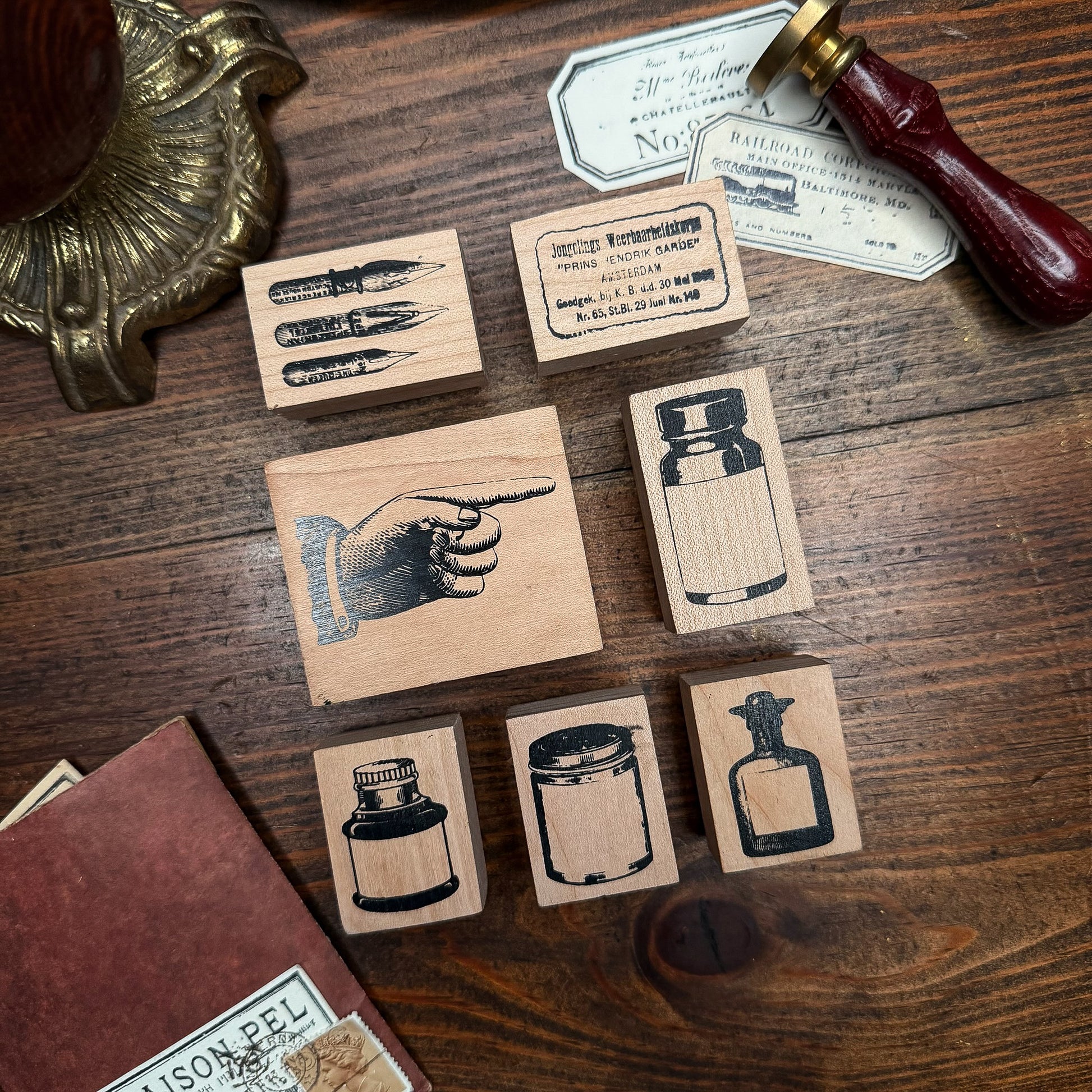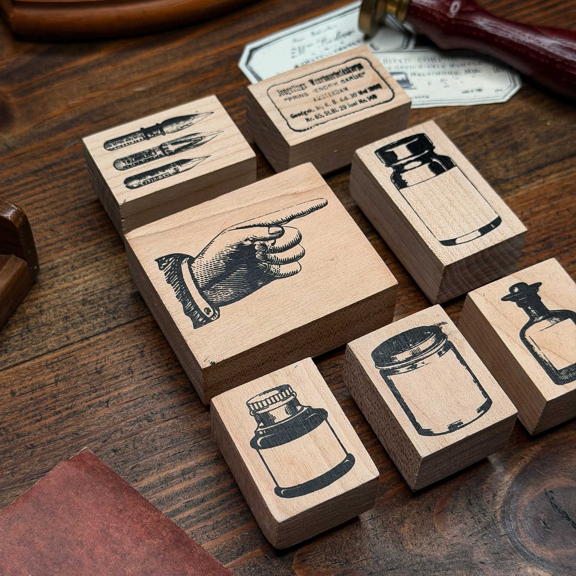 Sellos de caucho rojo montados en madera, compatibles con tintas permanentes, híbridas, gel, etc. Temática botellas vintage y señalamiento; este set te permite crear composiciones individuales o en conjunto, ya sea para proyectos de journaling o scrapbooking.